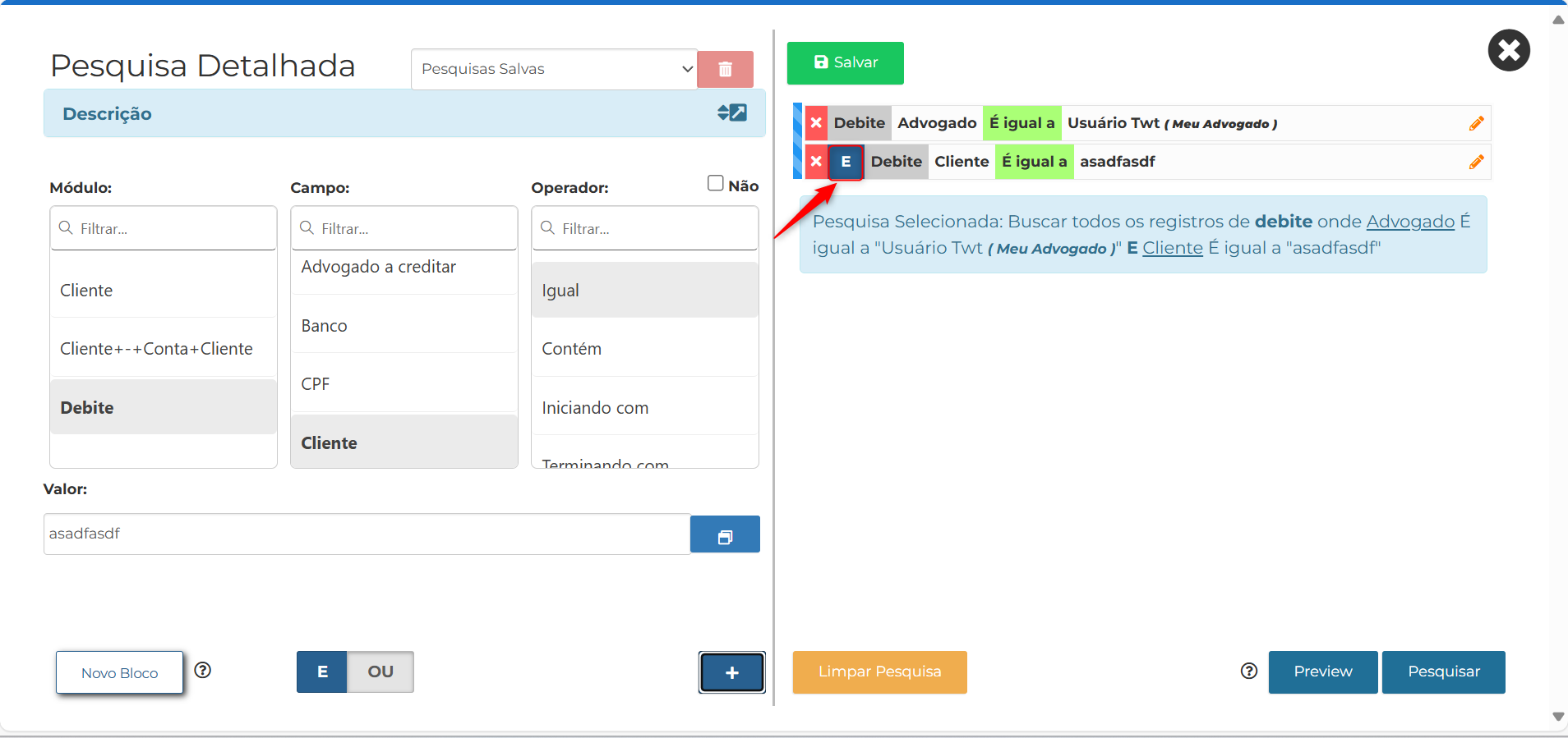 Se for necessário acrescentar mais de um parâmetro de pesquisa, as informações poderão ser combinadas em “E” e “OU”.