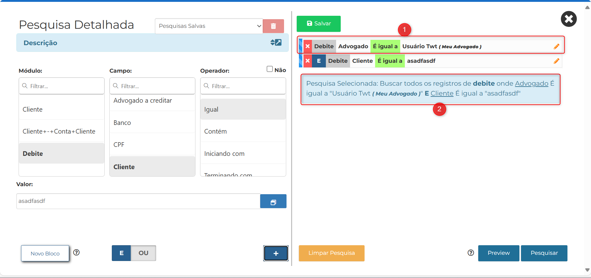 Após efetuar a montagem de um filtro de pesquisa, se for um filtro recorrente, é possível no ADVWIN+ deixar os filtros salvos para uma pesquisa rápida.